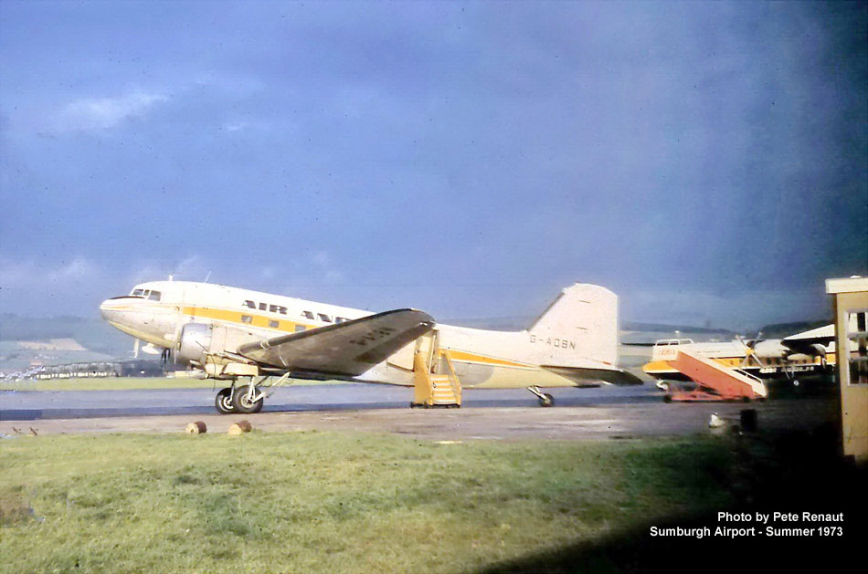 The photo to the right was taken by Pete Renaut, who was working on the oil rigs, and he saw AOBN as he passed through Sumburgh Airport. AOBN is in Air Anglia livery