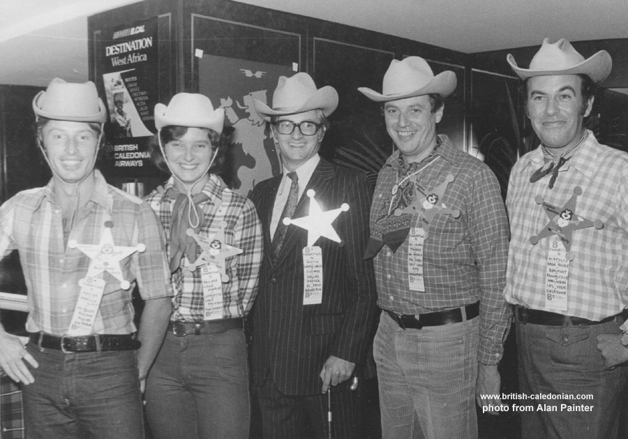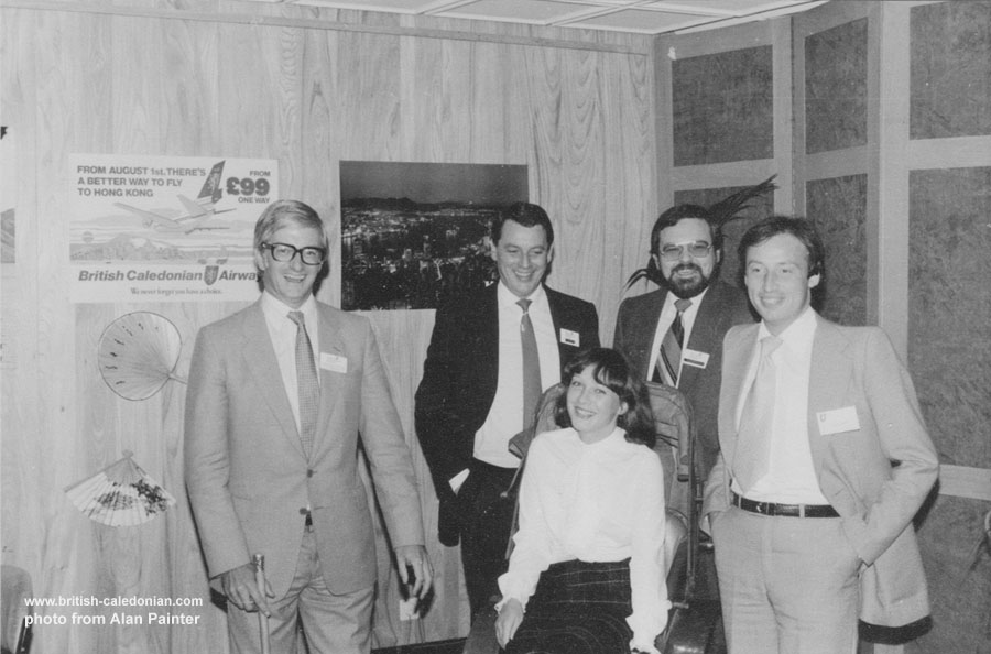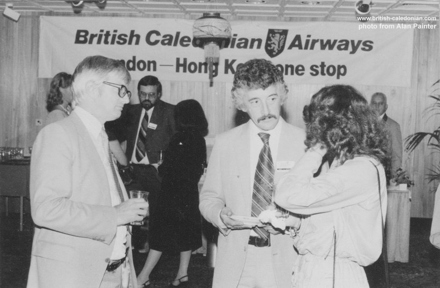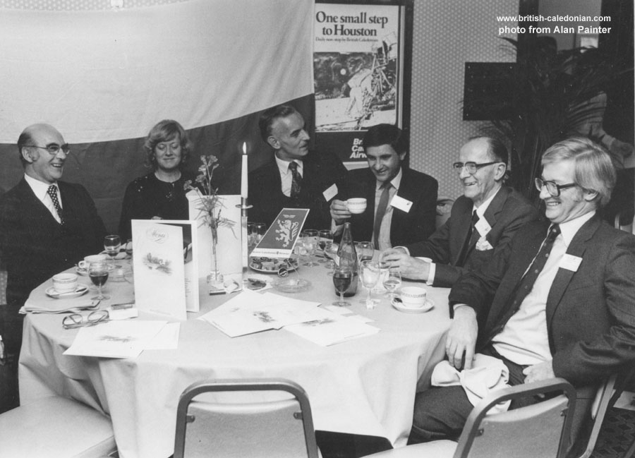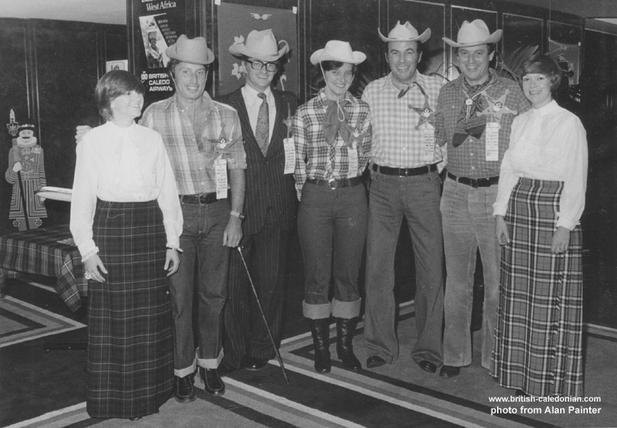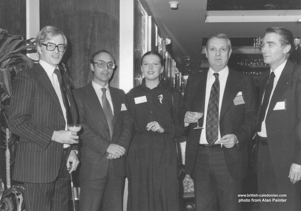 From left Alan Lambert (GM Sales), John Grant (Outstations Mgr), Mrs Lambert, Alan Parker (UK Sales), John Molyneux (UK Sales Supt), Several ?, ?, ? then Nikki Woodhead (A/H), then ?,?,?, Mary Hall (A/H with birdcage!), Alan Painter, George Carrol (MD Castle Holidays), then ?, ?, then Bunny Mason (Cargo Mgr), then ?, Mrs & Mr Nick Nicholls (Financial Director)