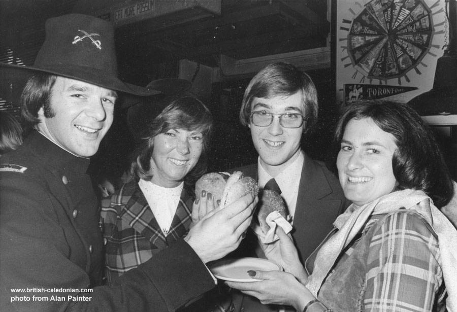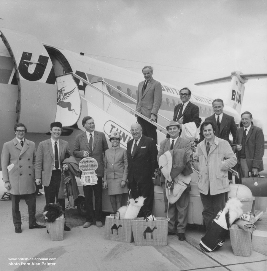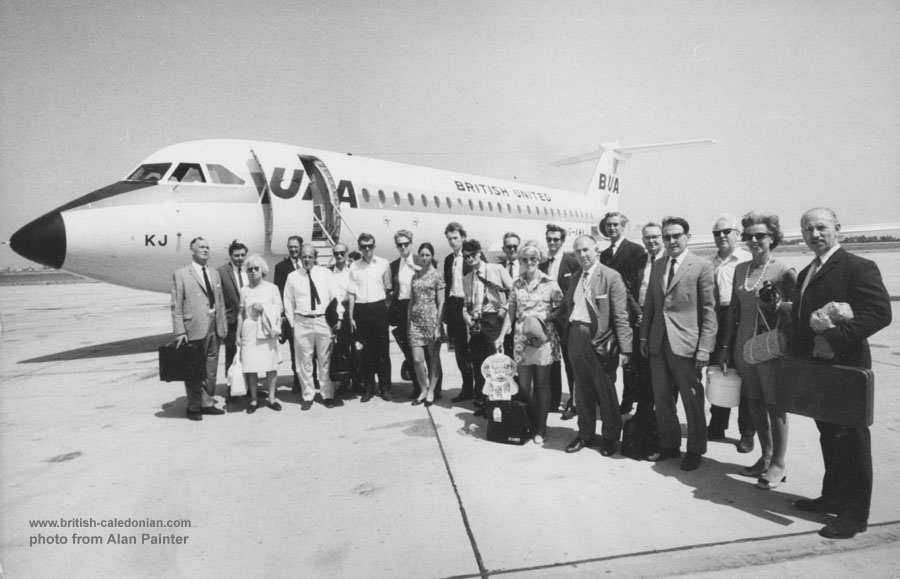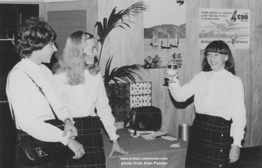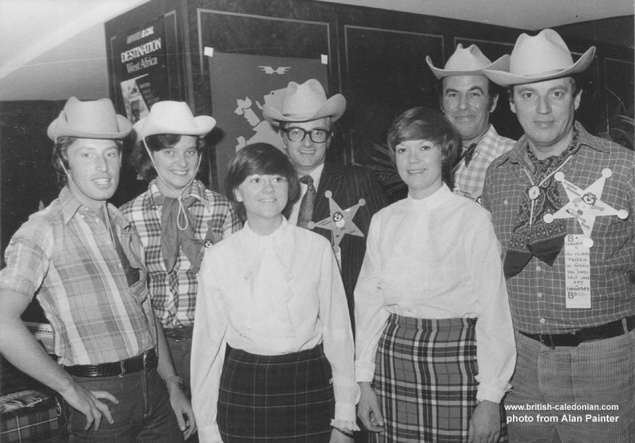 From left Alan Lambert (GM Sales), John Grant (Outstations Mgr), Mrs Lambert, Alan Parker (UK Sales), John Molyneux (UK Sales Supt), Several ?, ?, ? then Nikki Woodhead (A/H), then ?,?,?, Mary Hall (A/H with birdcage!), Alan Painter, George Carrol (MD Castle Holidays), then ?, ?, then Bunny Mason (Cargo Mgr), then ?, Mrs & Mr Nick Nicholls (Financial Director)