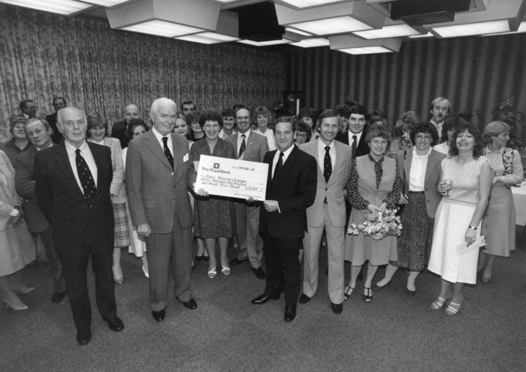 Adam Thomson & Andy Bridgeman, with BCal staff, hand the cheque over to Cancer Reseach's Sir John McKay