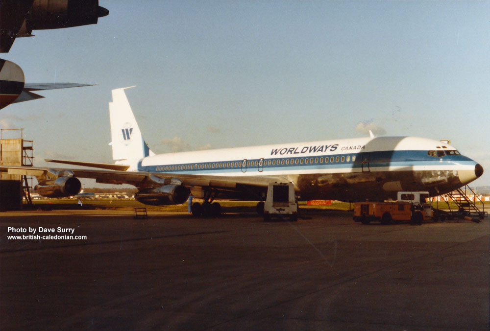 Former BCal 707 G-BDLM now painted up as Worldways C-GGAB (early 1982)