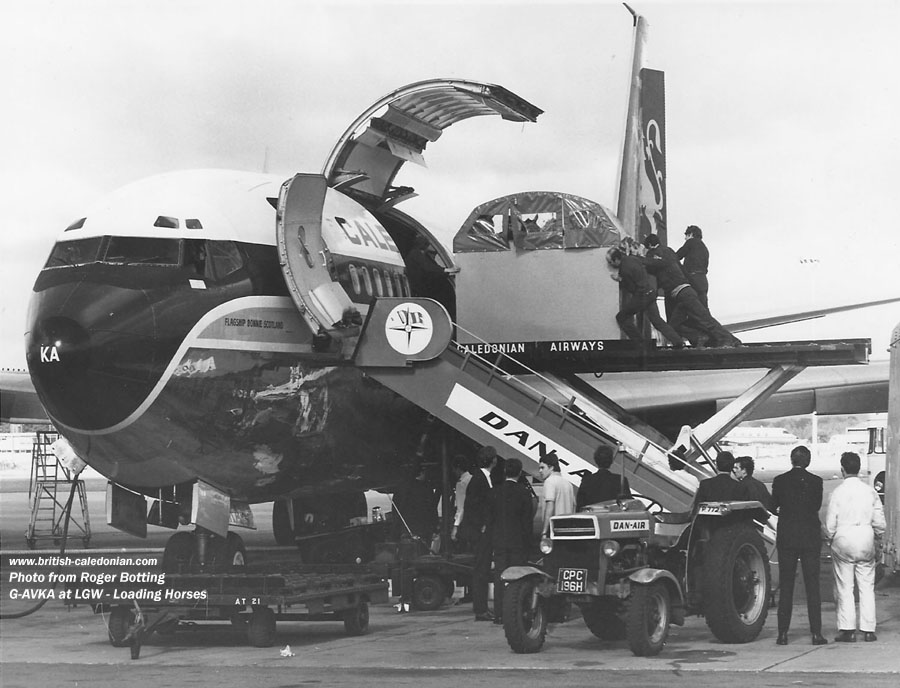 Caledonian Boeing 707 G-AVKA "Flagship Bonnie Scotland" at LGW with racehorses being loaded onboard