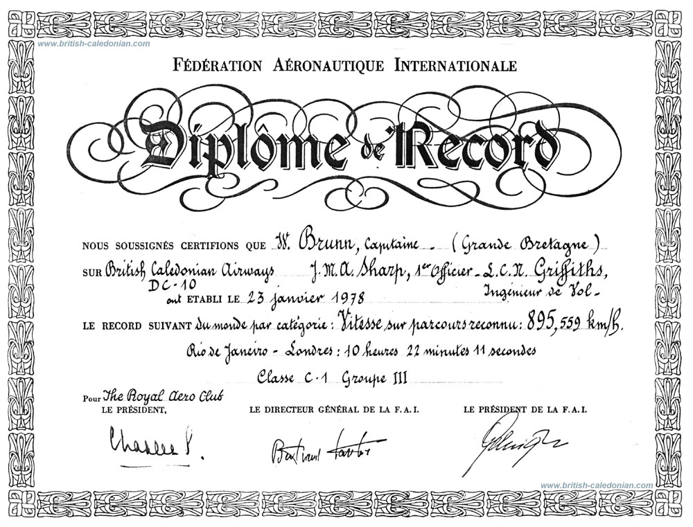 This records that Captain Brunn was in command of BCal DC10 (G-BEBL) flying between Rio de Janeiro and London on 23rd January 1978. First Officer Sharp and Flight Engineer Laurie Griffiths made up the three man flight deck crew.