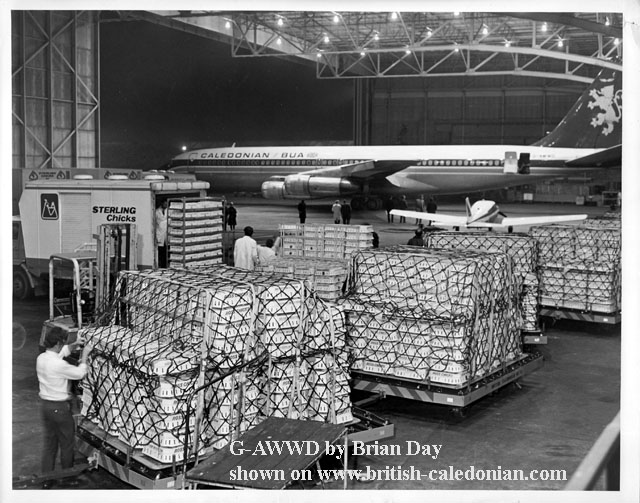 G Boeing 707-320C G-AWWD being readied for the loading of 270,000 day-old chick, a gift from the UK