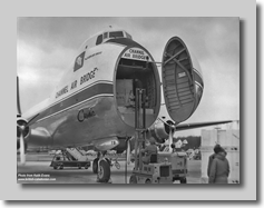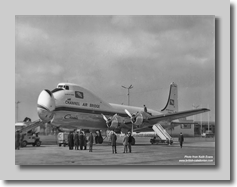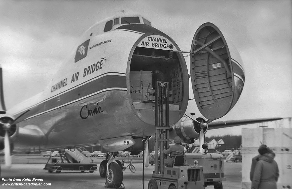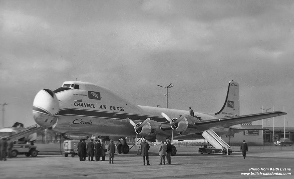 Taken by Geoffrey Evans, Channel Air Bridge's Carvair G-ANYB "Golden Gate Bridge" at Geneva on its inaugural service in April 1962.
