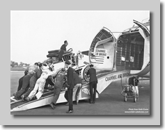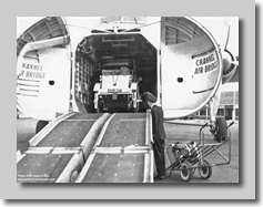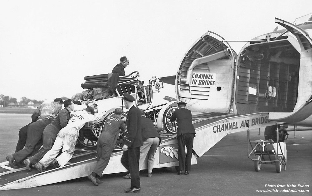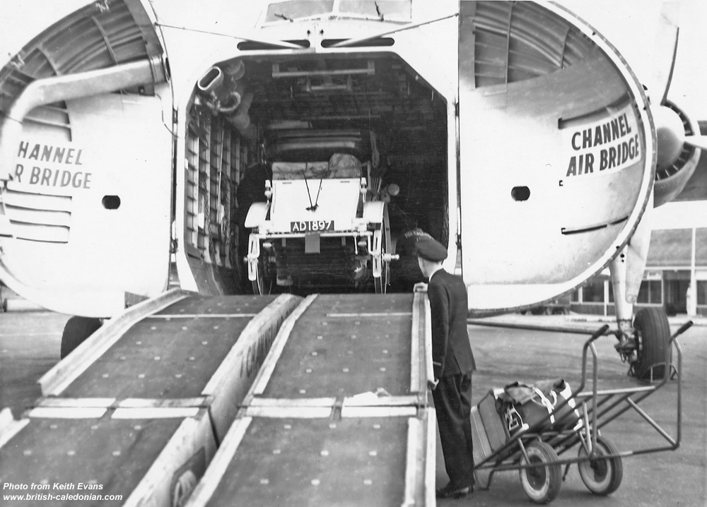 Taken by Geoffrey Evans, a 1897 Daimler Grafton Phaeton being loaded onto a Channel Air Bridge Bristol Freighter at Southend also sometime around 1962.