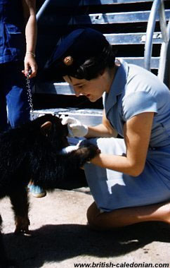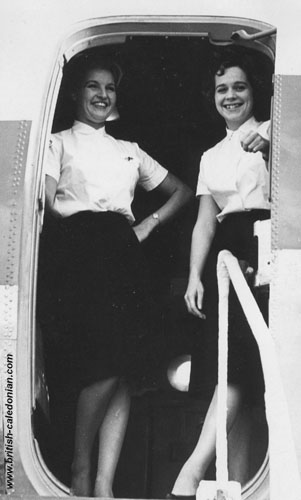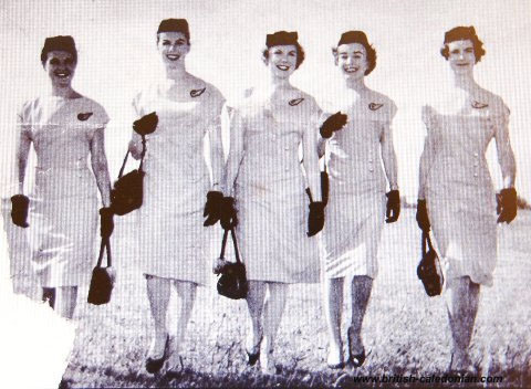 Hunting Clan air hostesses (approx 1959 or 1960) in tropical uniform -- light blue dresses. Angela is on the left.