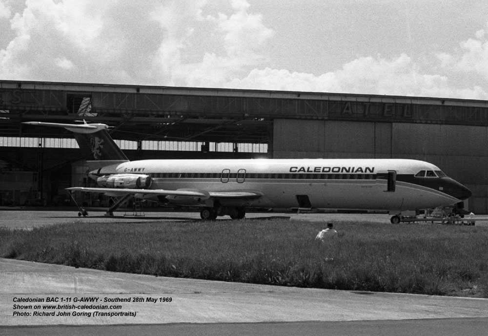 A super image of Caledonian One-Eleven G-AWWY. It paid its first visit to Southend on 27 May 1969 for a Check 1 (I think) by ATL and I caught it outside their hangar the following day. Name 'Isle of Iona' just discernible on the forward fuselage.