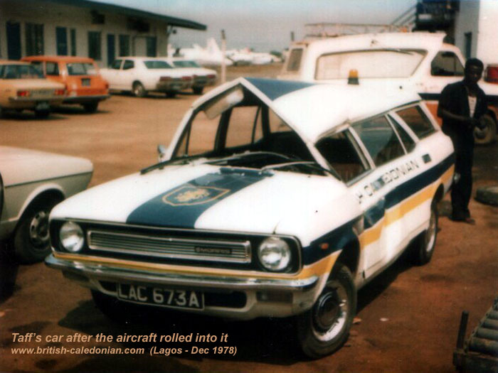 The picture of the car below was a funny, but lucky, incident. When parked behind the engine of the aircraft on the ramp at Lagos, for some reason the aircraft rolled back and onto the company car with Taffy still in it.